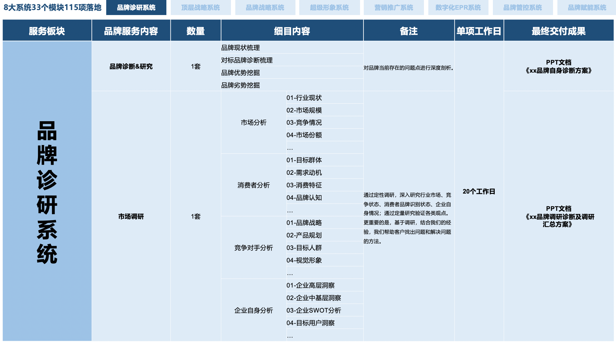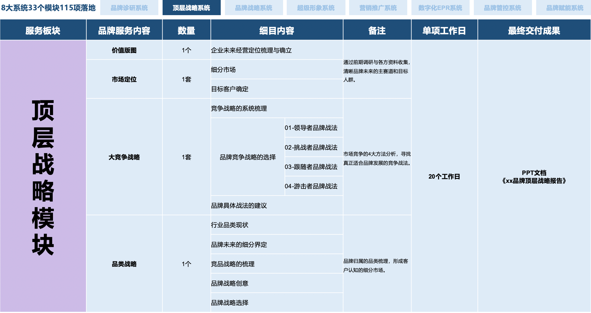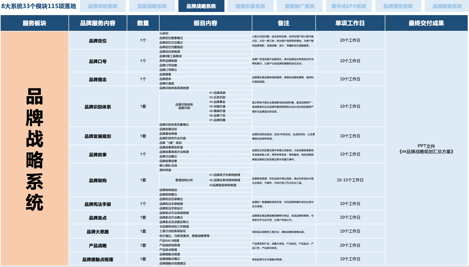 “5大顶层战略 + 58大品牌模块 + 33大战略落地 + 119个品牌细项”