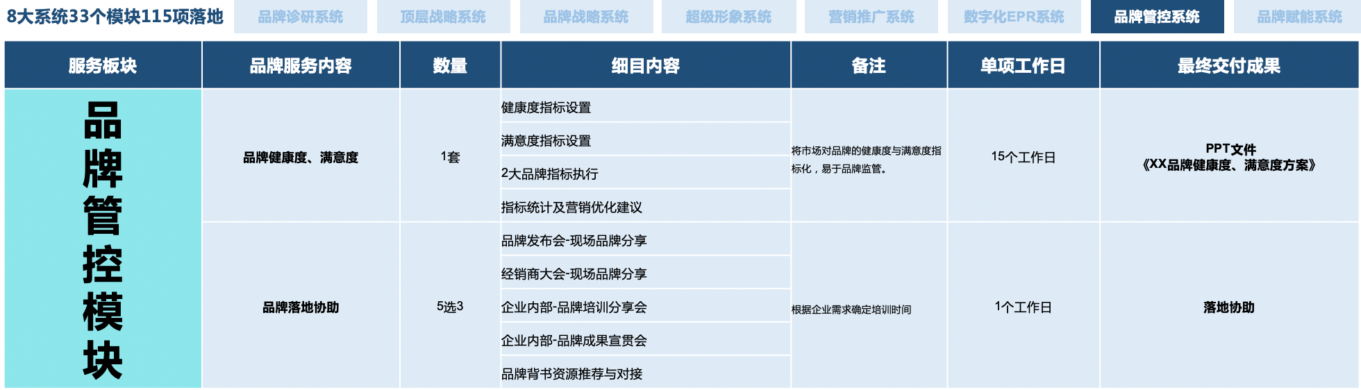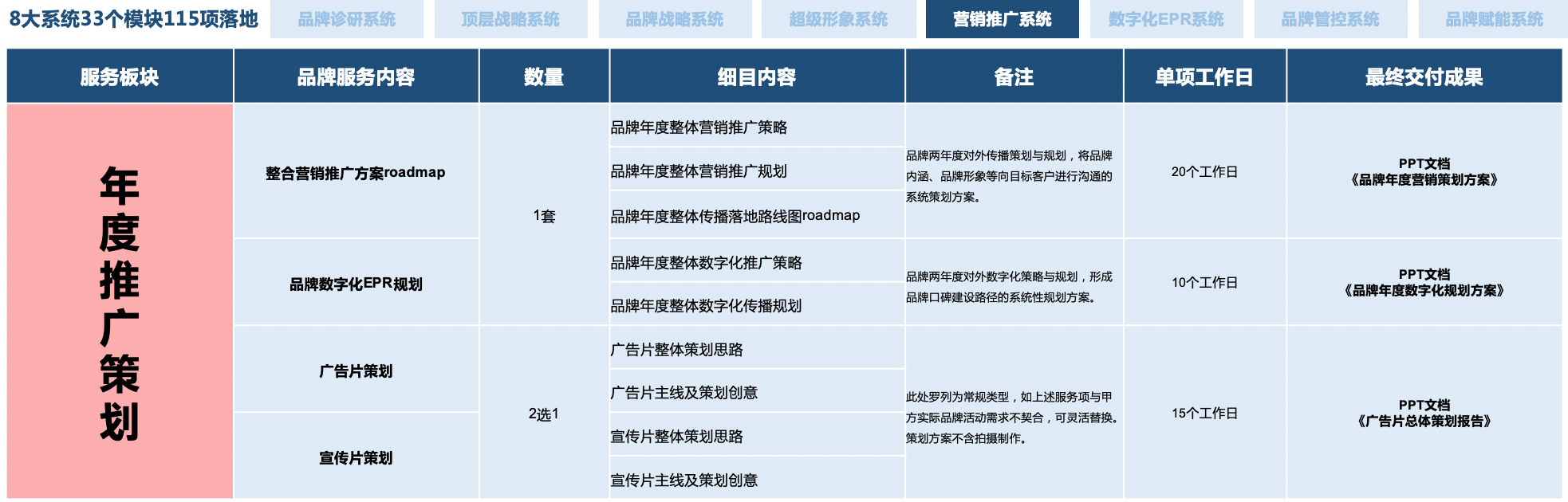 5大顶层战略+58大品牌全模块+9大营销整合系统+119项品牌实效落地