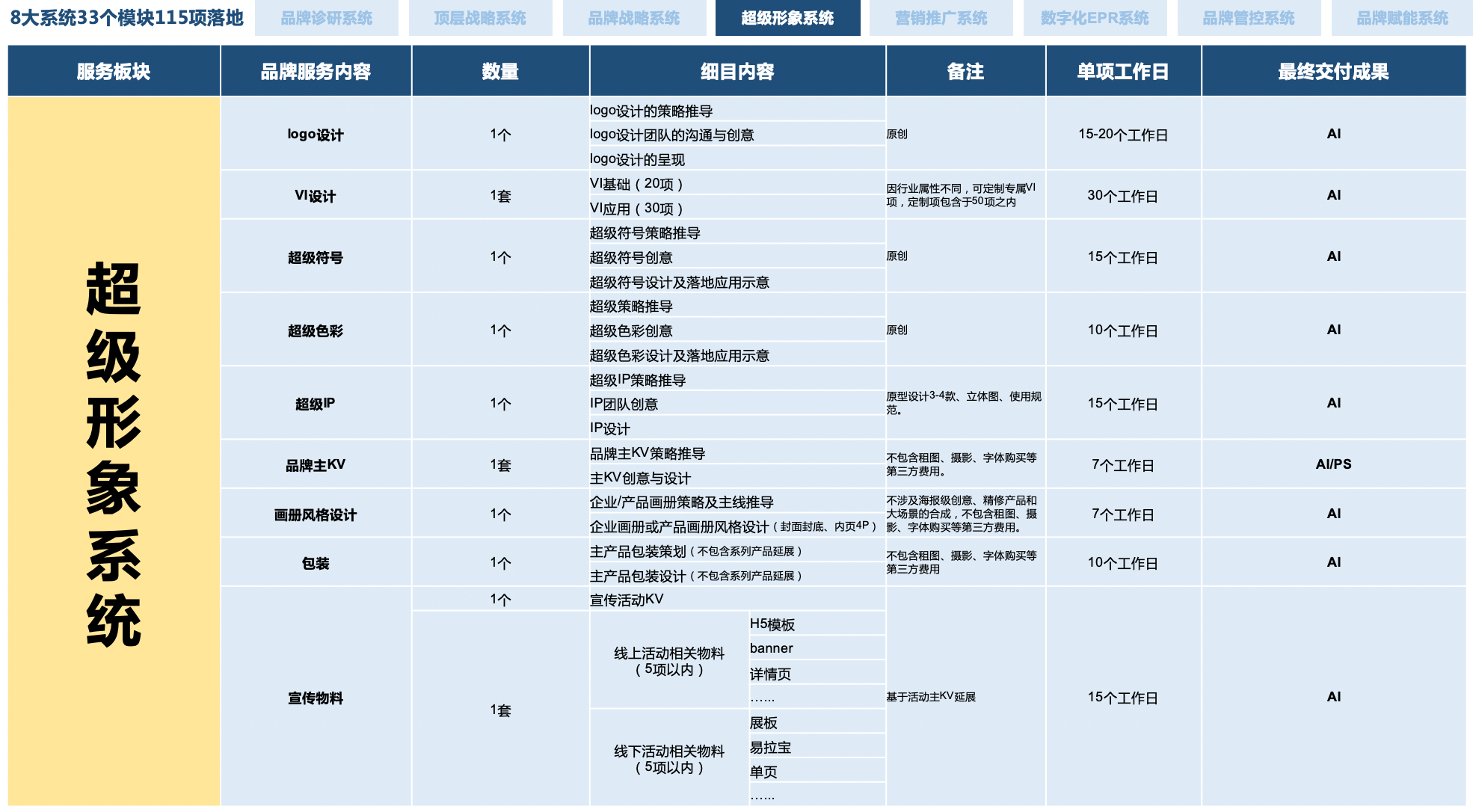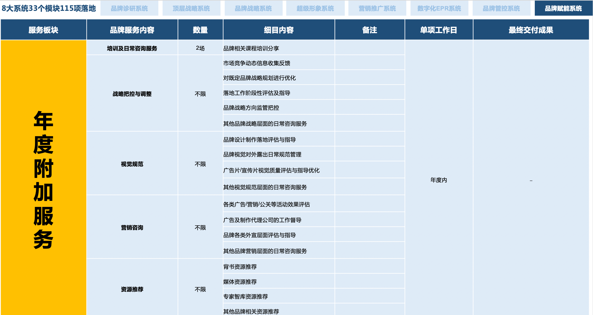 顶层战略+品牌咨询+营销策划+设计落地+数字传播+推广运营+资源赋能+系统培训