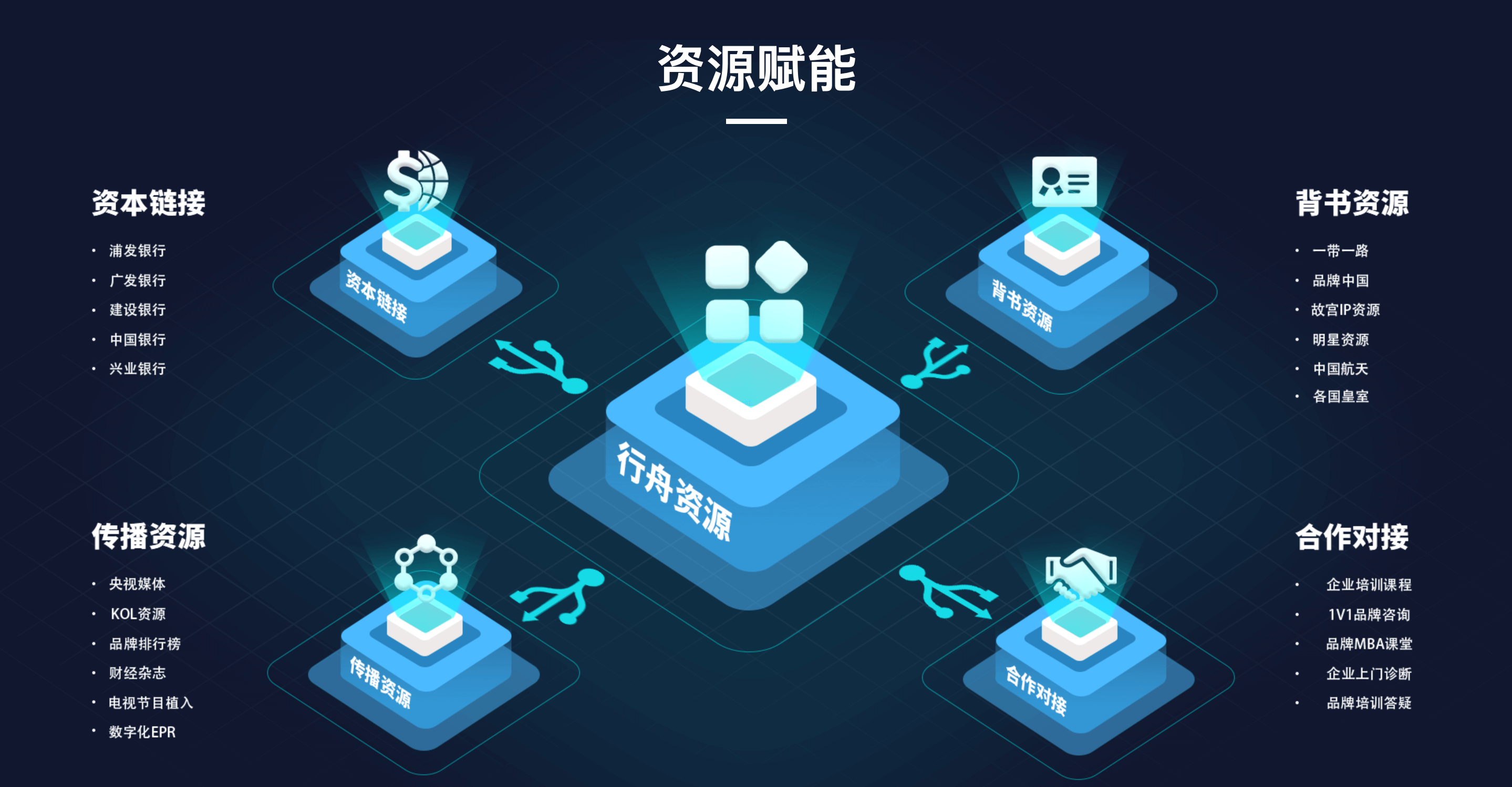 品牌在发展过程中,基于发展阶段需要得到全方位赋能支持,包括:背书资源、专家资源、资本资源、媒体资源、培训资源等等资源支持。